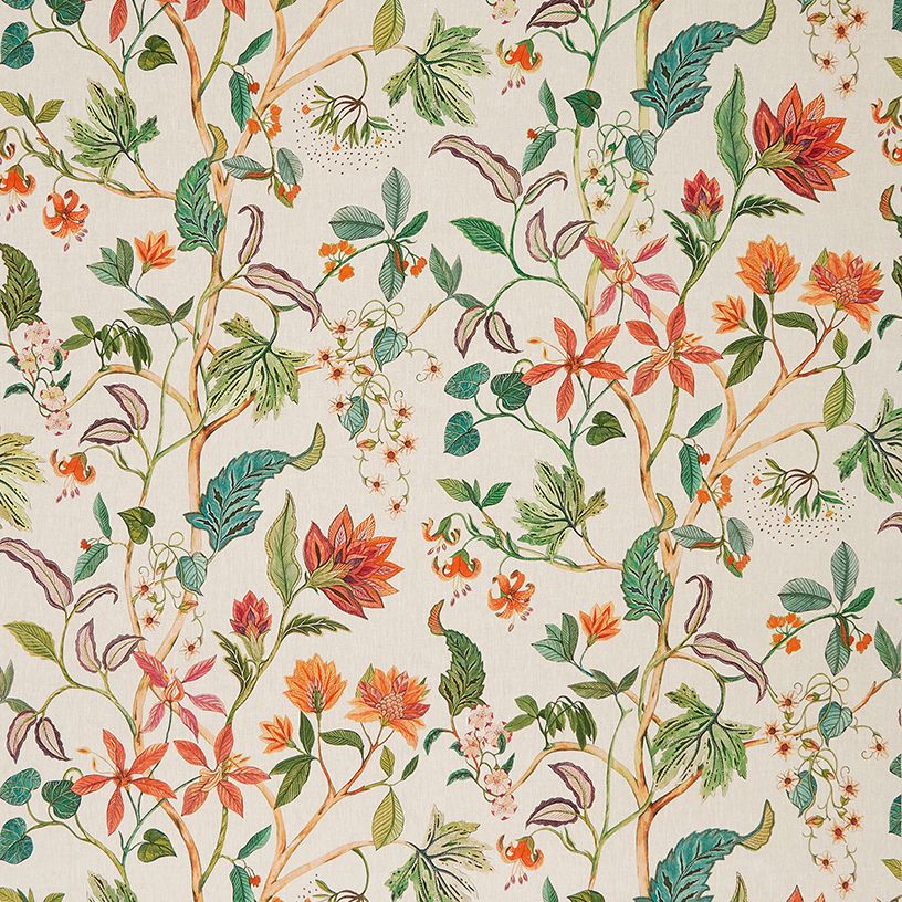 Inspired by Indian Mughal style, a floral trail of tiger lilies and exotic flowers weaves around a central meandering stem. Printed on linen. Named after the Chellah Gardens located in Rabat, Morocco.