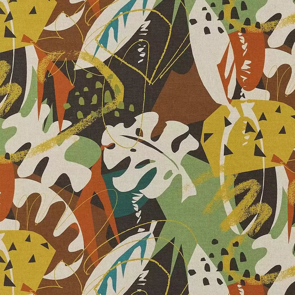 Abstract paper-cut leaf shapes are arranged in a colourful printed collage. A painterly free-style line sweeps across the design.