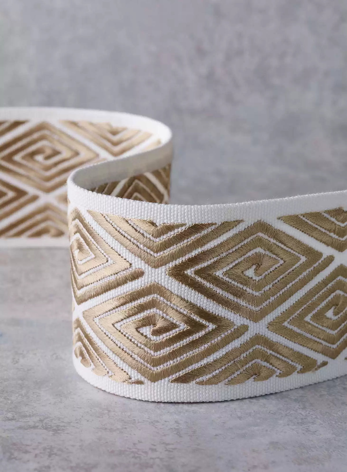 The Operetta Braid is the widest of the trimmings, measuring about 11 centimeters across. This decorative textile is made in India from a blend that is almost evenly split between 51% cotton and 49% viscose. [split_description] Brand Osborne & Little Collection Savoy Braids Design...- $298.00