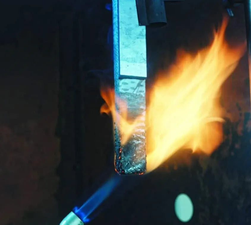 In the photo below, we can see how CRIB 5 testing is performed. Although the furniture is fire retardant, it does not necessarily mean it would be burn proof. Instead, it withstands the heat and does not let it spread as quickly as compared to ordinary fabric.