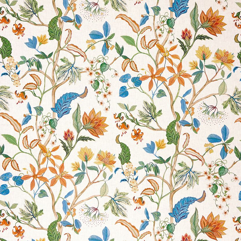 Inspired by Indian Mughal style, a floral trail of tiger lilies and exotic flowers weaves around a central meandering stem. Printed on linen. Named after the Chellah Gardens located in Rabat, Morocco.