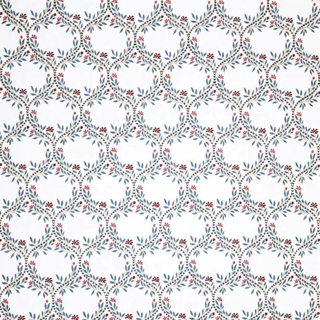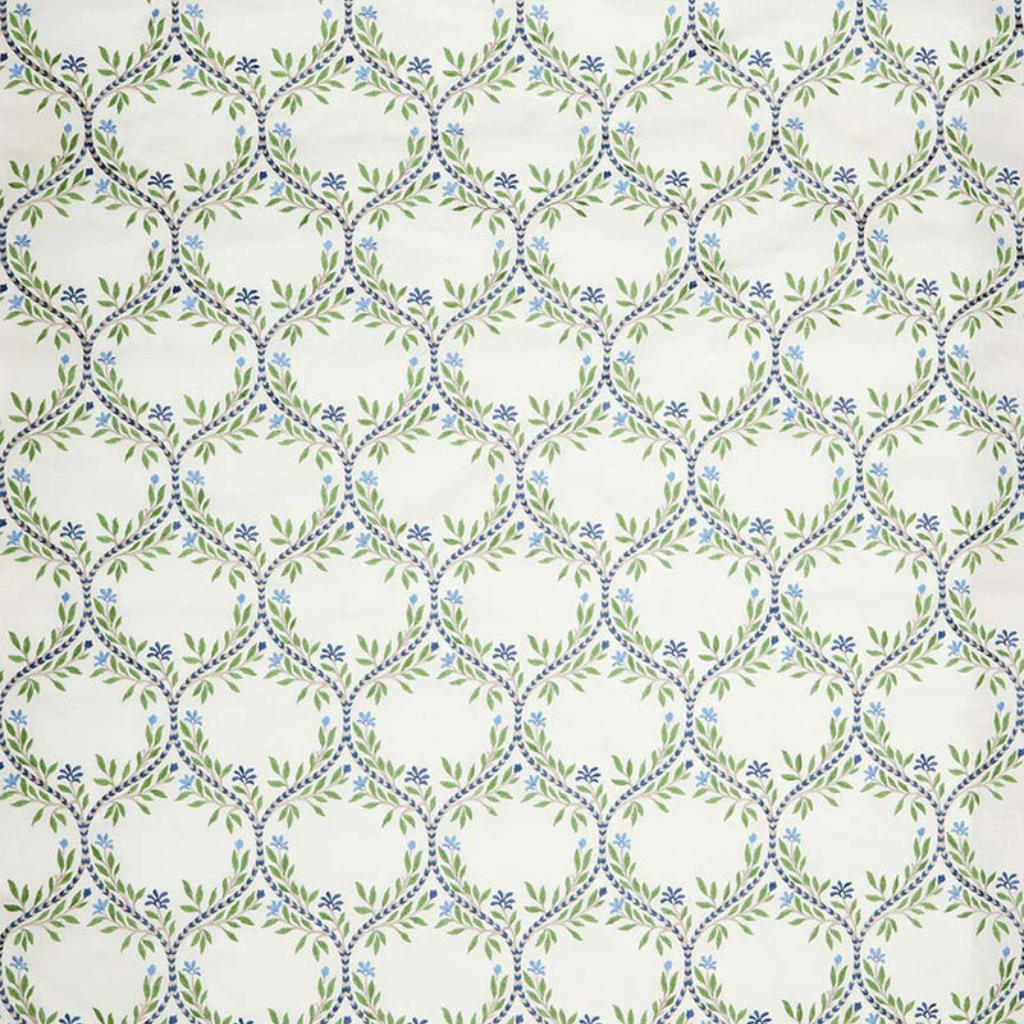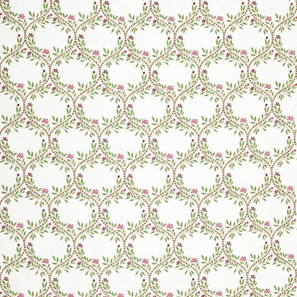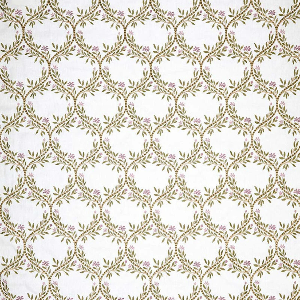 An embroidered elegant ogee trellis with a chevron pattern is adorned with pretty flowers and leaves on a 100 % linen ground.