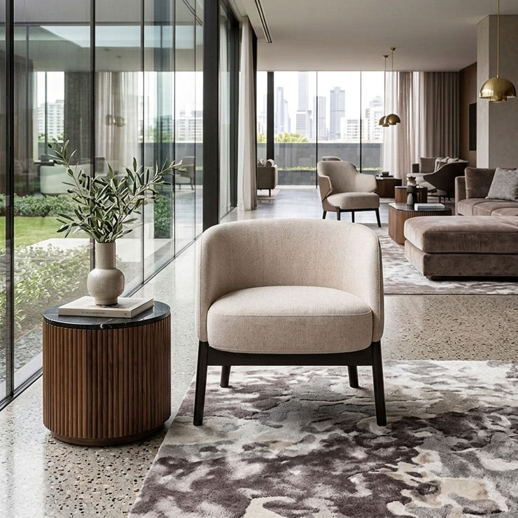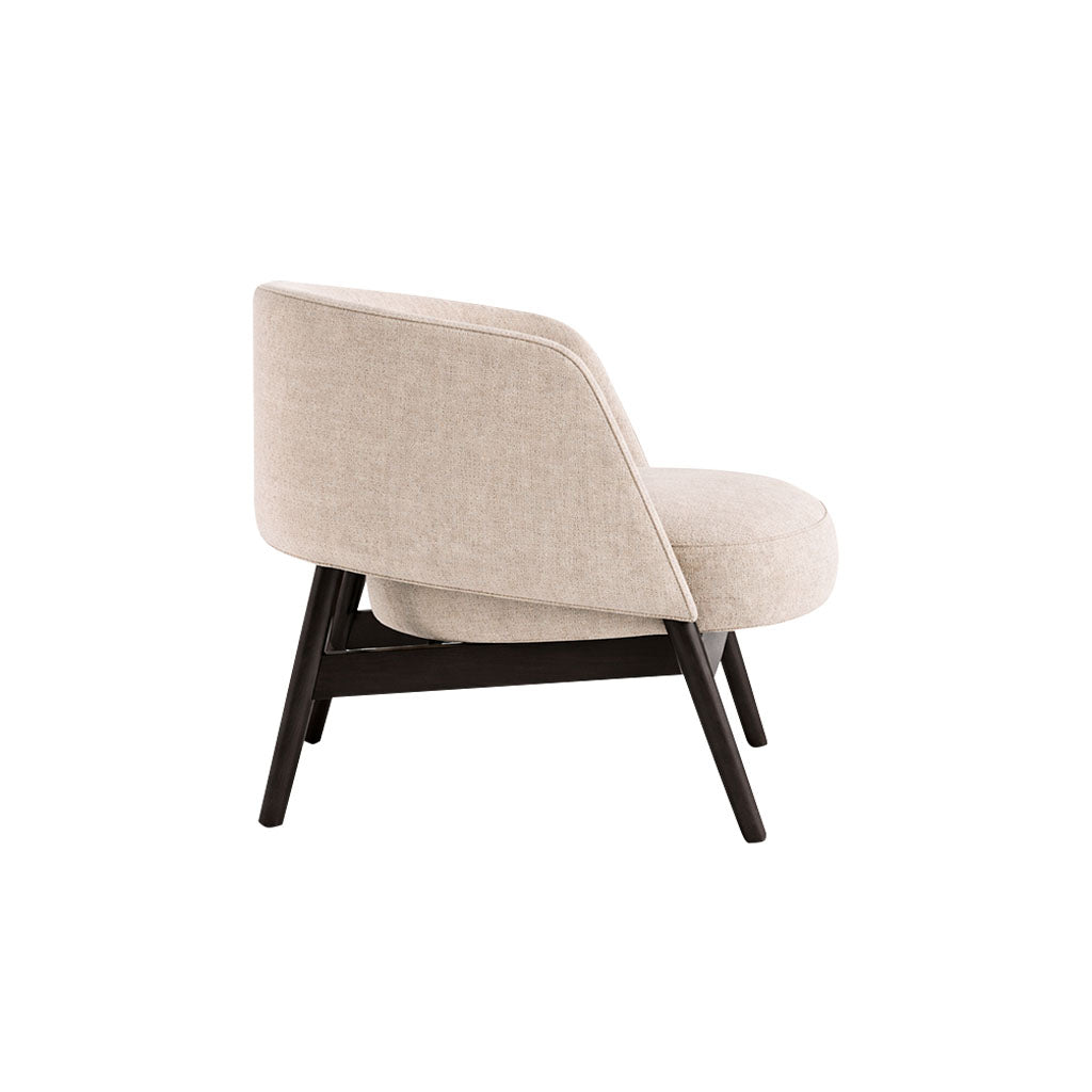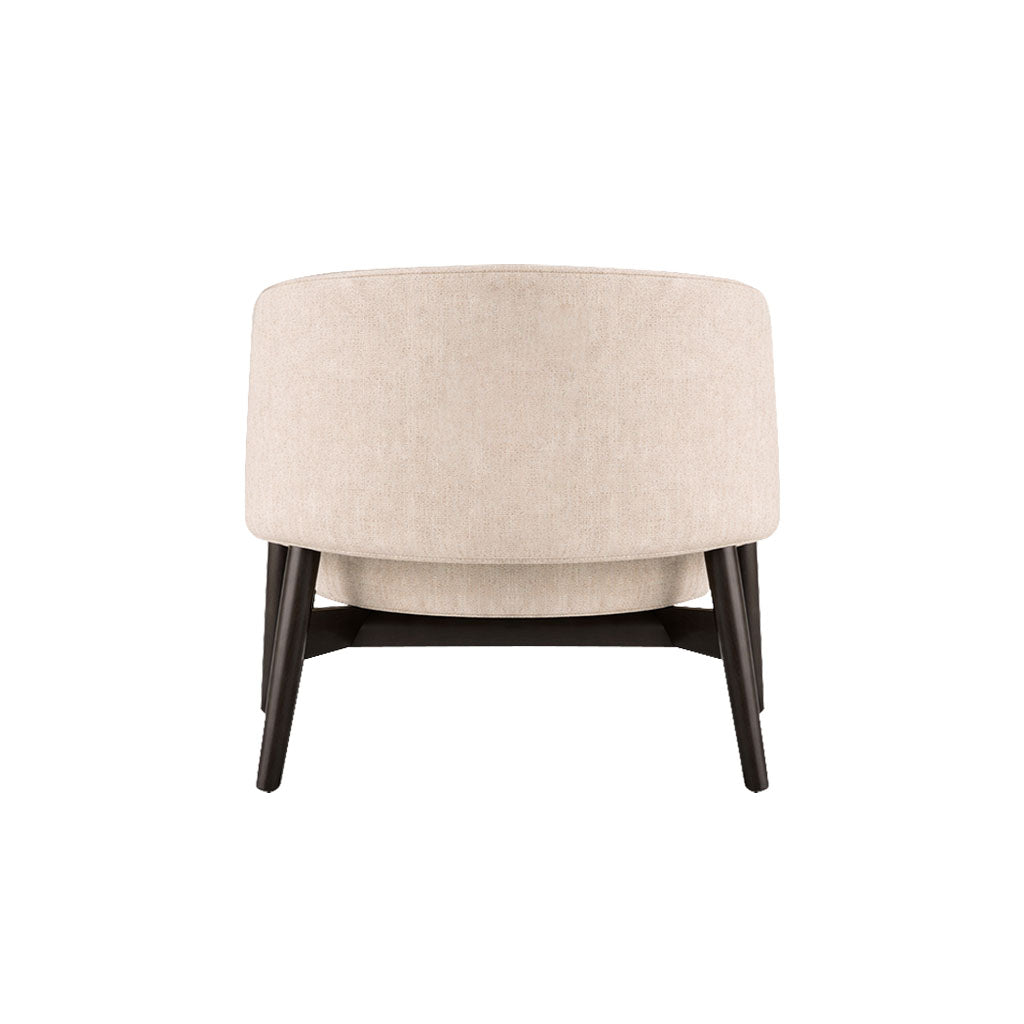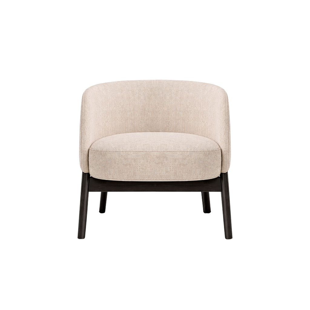 The Lucy Armchair blends modern elegance with everyday comfort. Wrapped in soft textured upholstery, its curved backrest and generous cushion create an inviting seat. Dark wooden legs add warmth and structure, making it a refined accent for living rooms, reading corners, or lounge spaces. Fabric upholstery can be customized to suit your interior style.