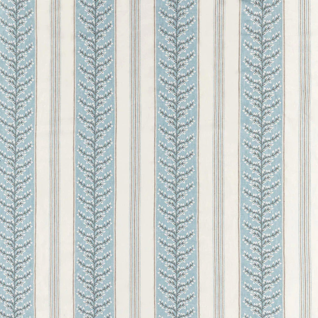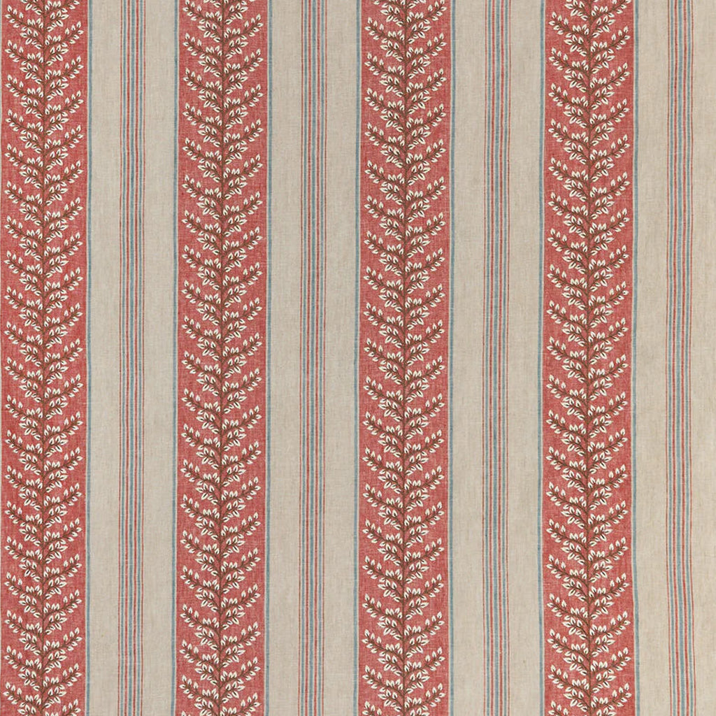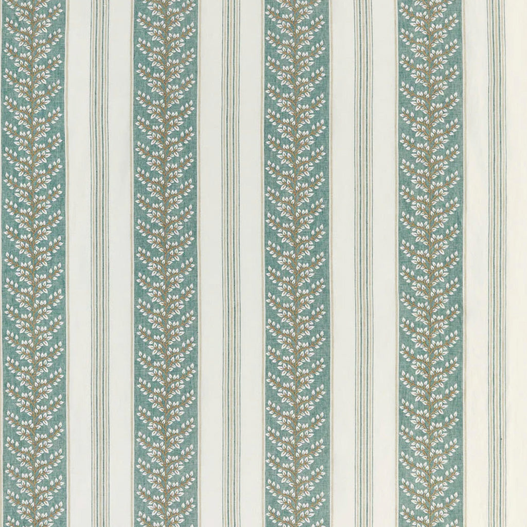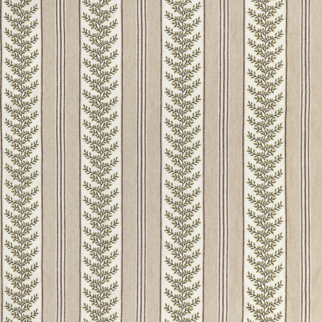 Climbing stems with branches abundant with bud-like leaves are embroidered within a linen woven stripe design.