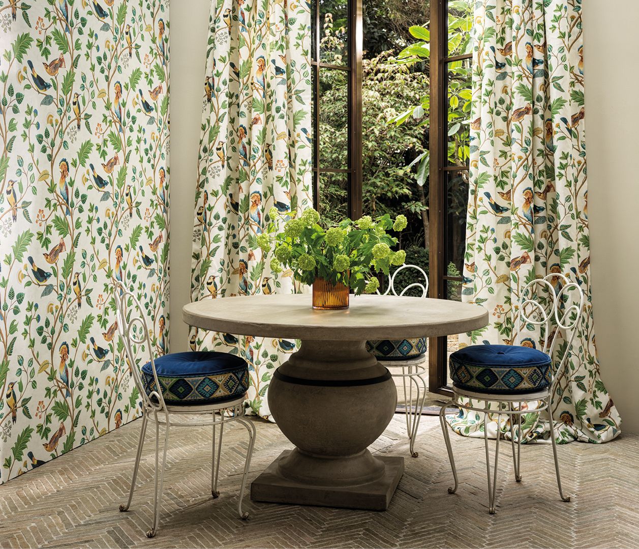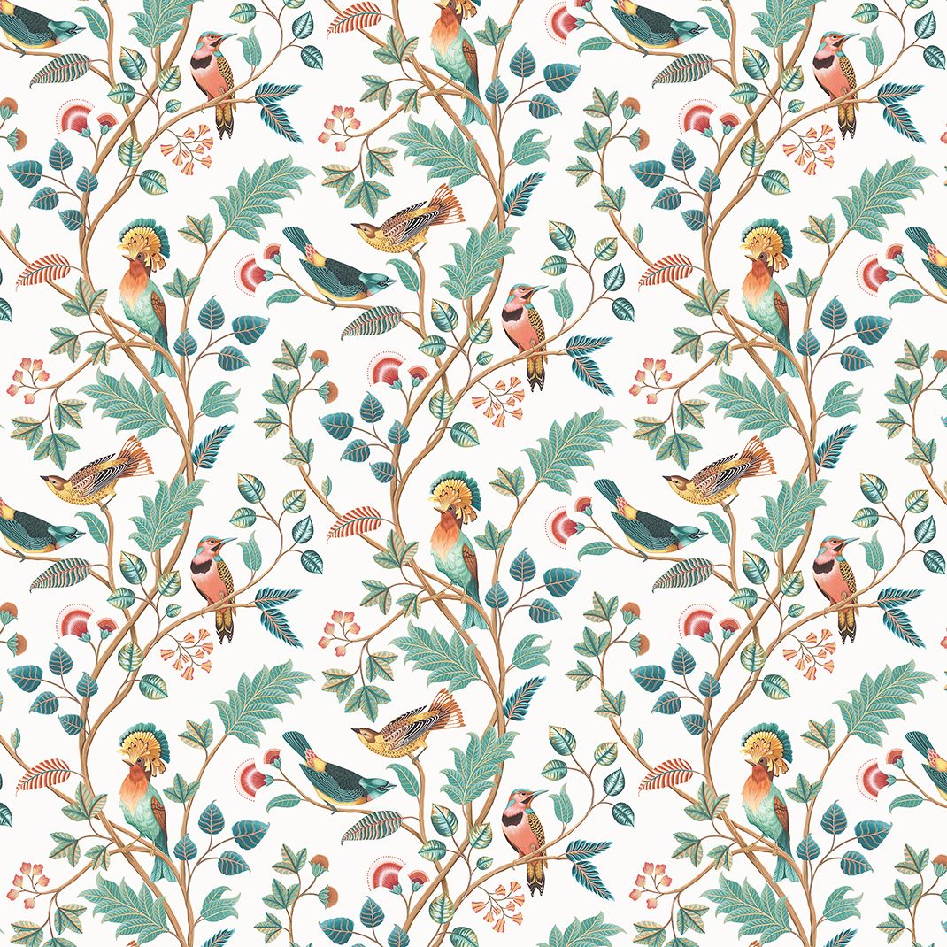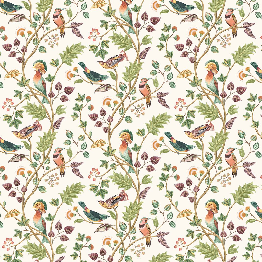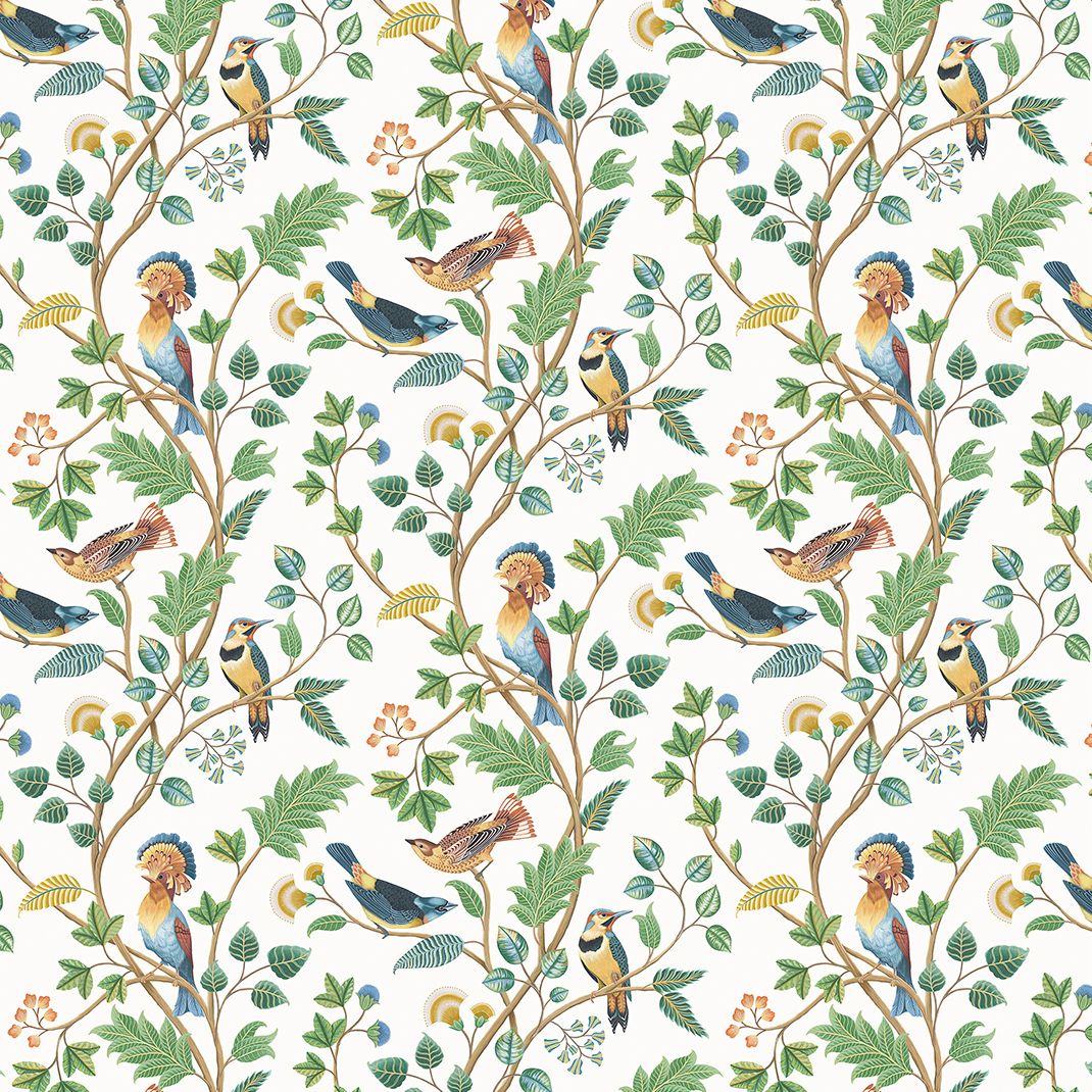 Beautiful decorative birds are intricately painted, perch on leafy trailing branches. Printed on linen. The Mayani Bird Sanctuary is a famous bird sanctuary in India.