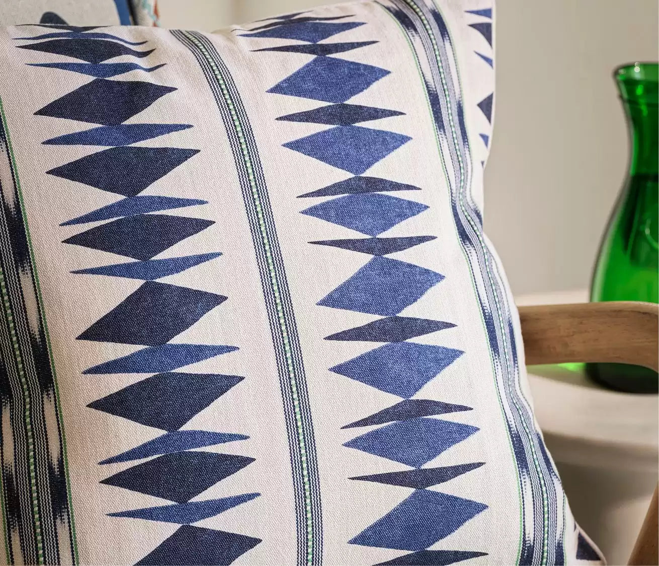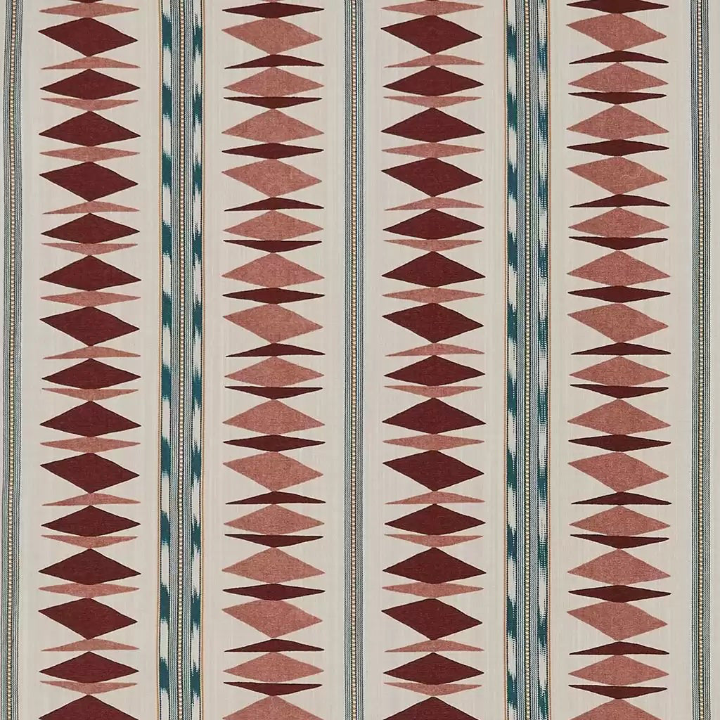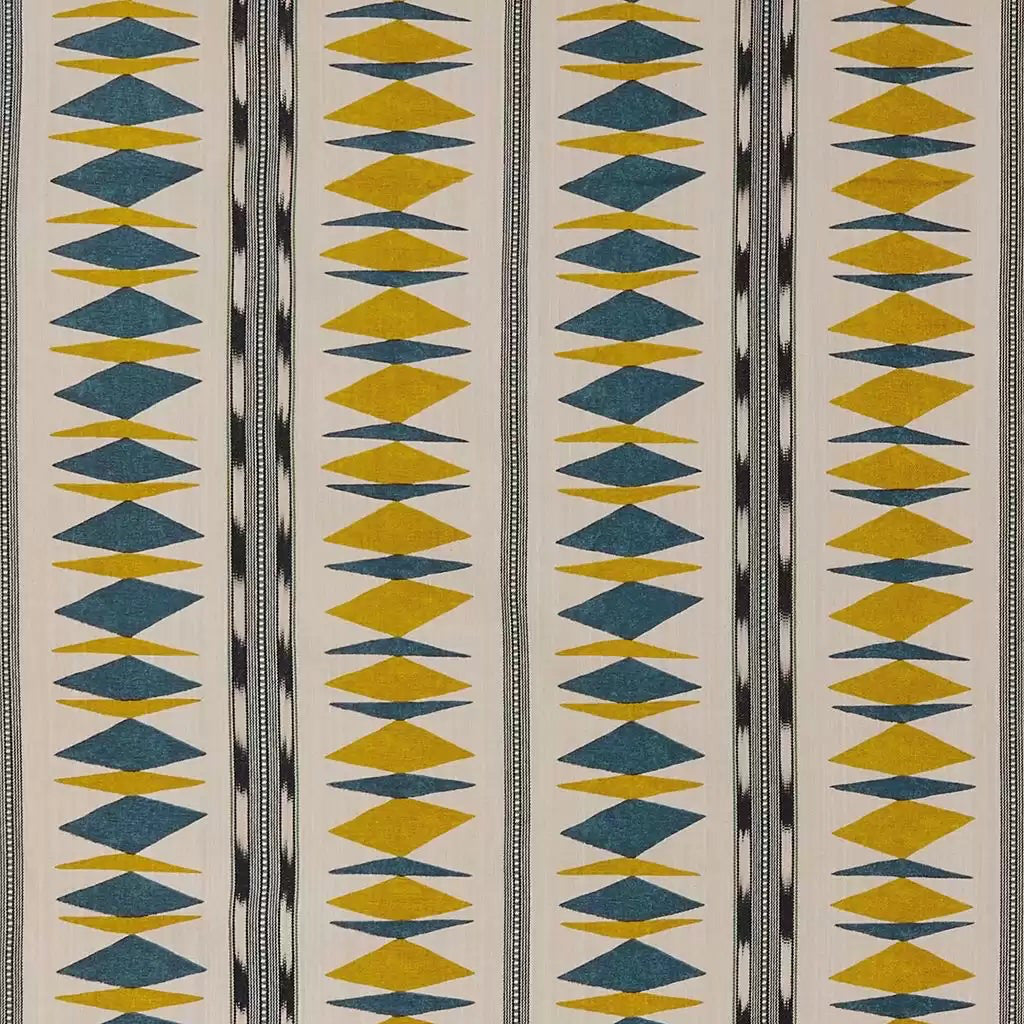 Asymmetrical diamonds are hand-printed on a jacquard woven ikat stripe fabric.