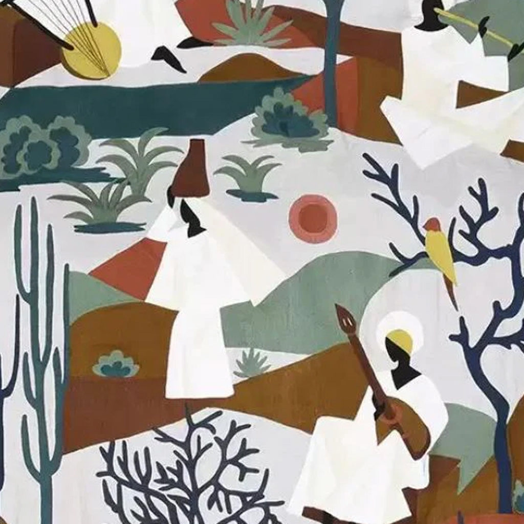 A magnificent scenic panel design of musicians in a peaceful landscape. The design is illustrated in crewel embroidery.